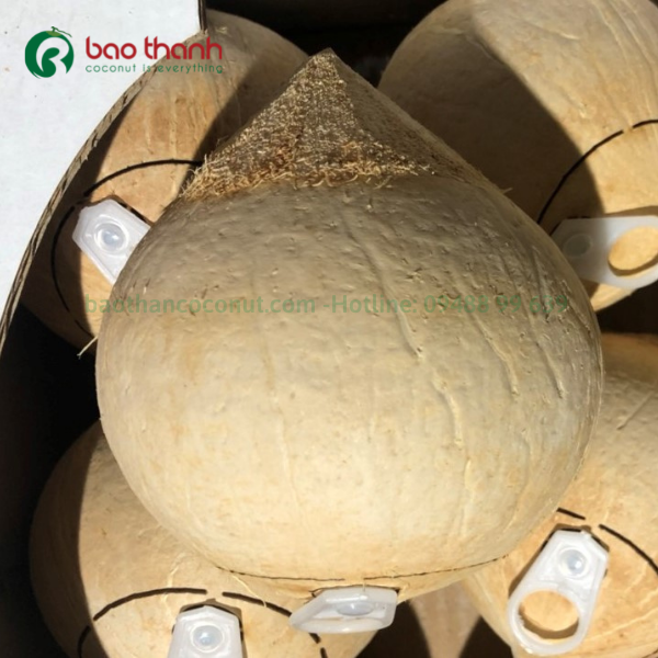 Trái dừa xiêm xanh sau khi được thu hoạch tại các vườn dừa hữu cơ đạt chuẩn tại Bến Tre được làm sạch rồi bóc vỏ và tiến hành bước gọt trọc với chóp hình gọt sương hay hình nón che con mắt cái của trái dừa tránh khỏi va đập trong quá trình vận chuyển.
