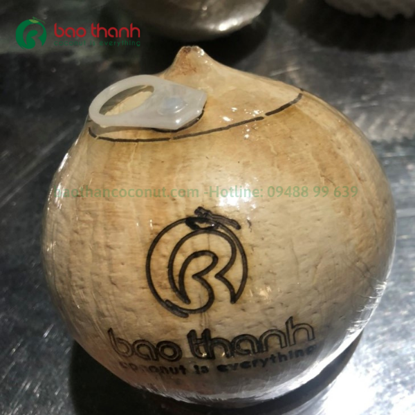 Để tạo nên một sản phẩm hấp dẫn, trái dừa nắp khoen còn được khắc laser với tên thương hiệu, logo đẹp mắt ấn tượng theo yêu cầu của quý khách hàng, công ty yêu cầu.